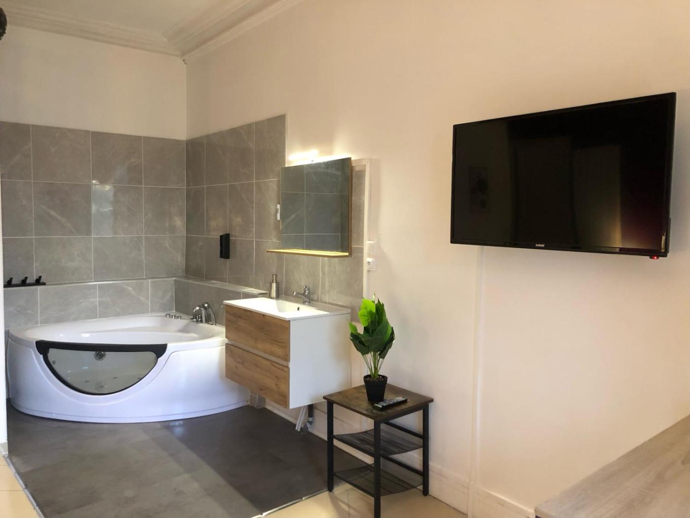 Chambre Double avec Baignoire Spa. Cette chambre double comprend une kitchenette où vous pourrez préparer vos repas et conserver vos aliments. Offrant une vue sur le jardin, cette chambre double dispose dun bureau, dune terrasse et dune salle de bains privative. Ce logement comporte 1 lit. ;