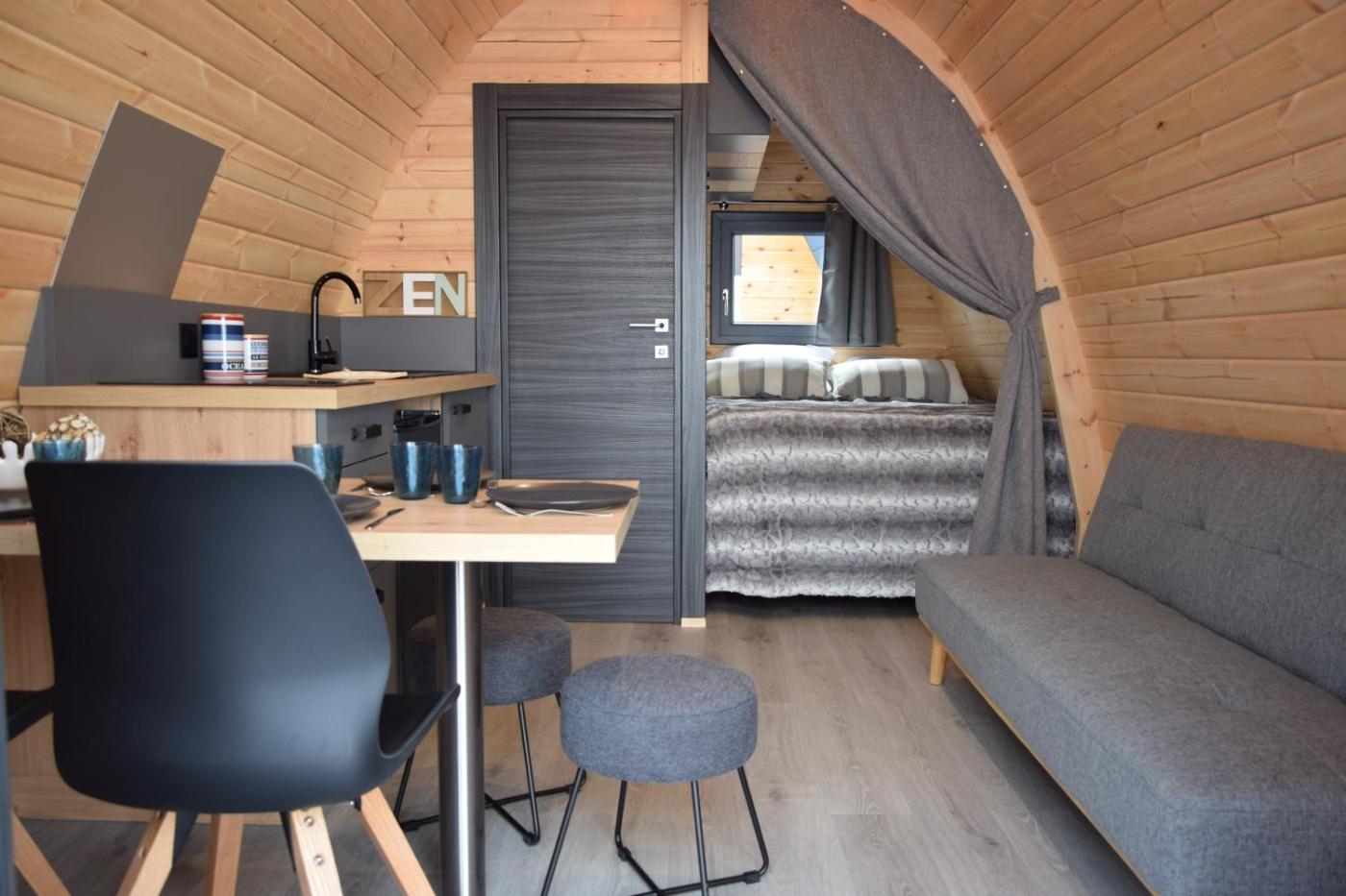 Chalet. Ce chalet climatisé comprend une entrée privée, un salon, 2 chambres séparées et une salle de bains avec une douche. La kitchenette bien équipée est pourvue de plaques de cuisson, d’un réfrigérateur, d’un micro-ondes et d’ustensiles de cuisine. Le chalet possède également un barbecue. Doté de murs insonorisés, le chalet dispose dun coin salon et dune terrasse. Une machine à café est également fournie. Le logement comporte 4 lits. ;