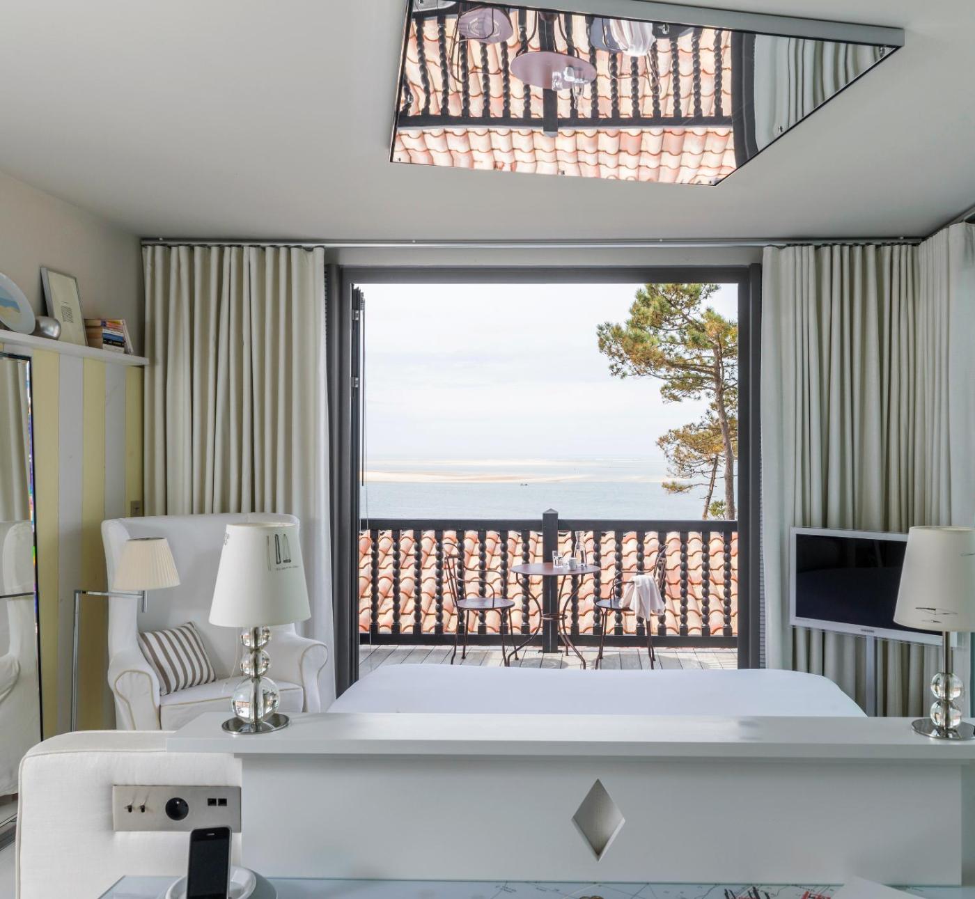 Chambre Double Ferret. Cette chambre de 25 à 30 m² bénéficie dun balcon de 3 m² orienté au nord (côté rue, qui peut être bruyant lorsque lhôtel ferme et tôt le matin lors des livraisons), dune vue sur le bassin dArcachon, dun lit king-size et dune salle de bains avec douche à litalienne. ;