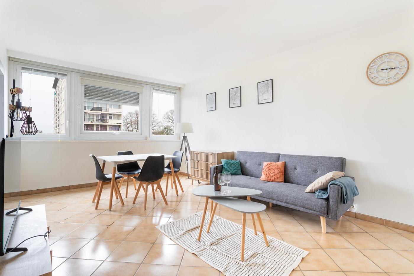 Appartement 2 Chambres. The fully equipped kitchen features a stovetop, a refrigerator, a dishwasher and kitchenware. The spacious apartment offers a washing machine, a tea and coffee maker, a dining area, a flat-screen TV, as well as garden views. The unit offers 2 beds.