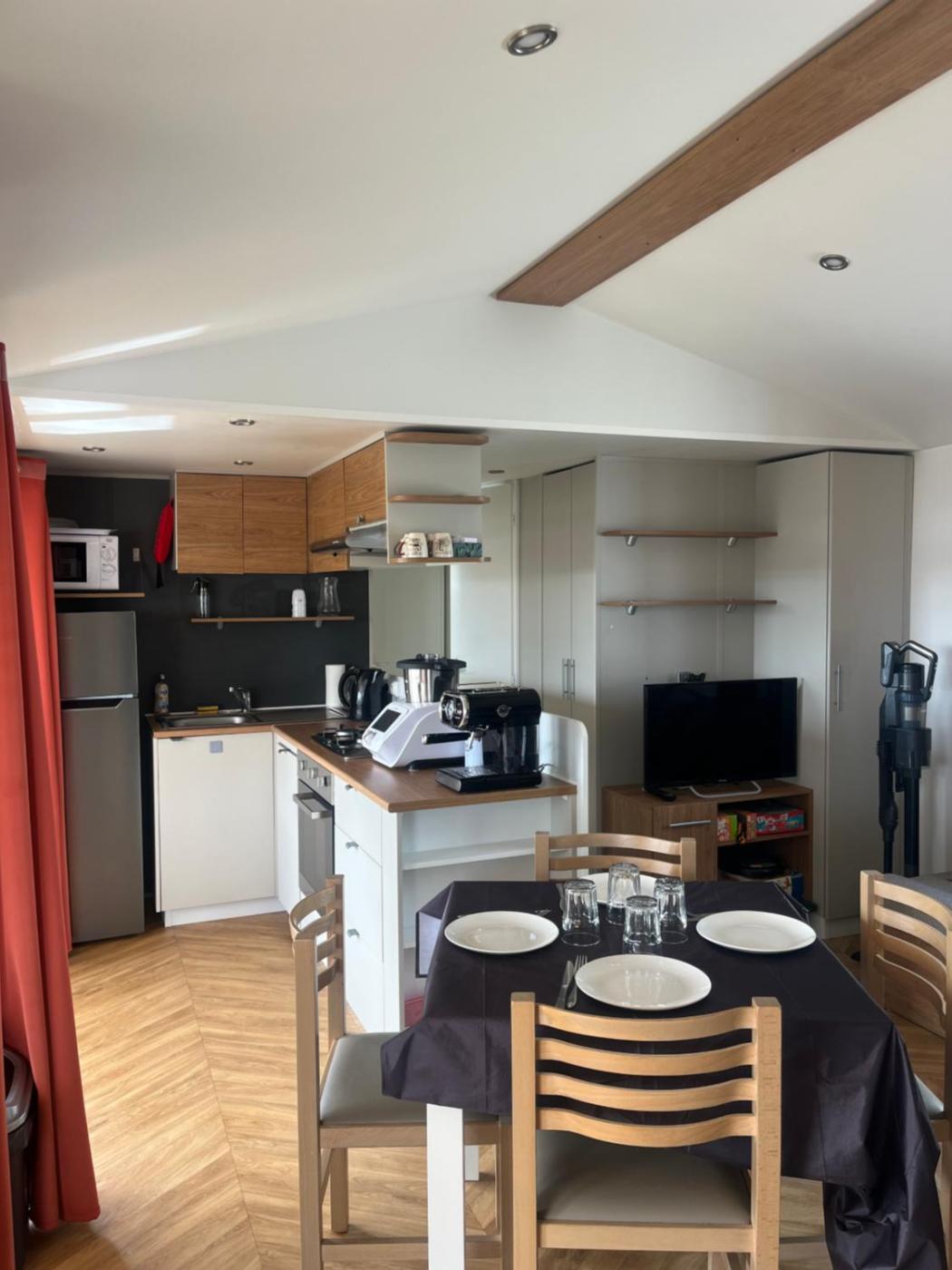 Mobile Home. In the fully equipped kitchen, guests will find a stovetop, a refrigerator, a dishwasher and kitchenware. This mobile home is air-conditioned and has a seating area with a flat-screen TV, a washing machine, a private entrance, a tea and coffee maker, as well as a dining area. The unit has 6 beds.