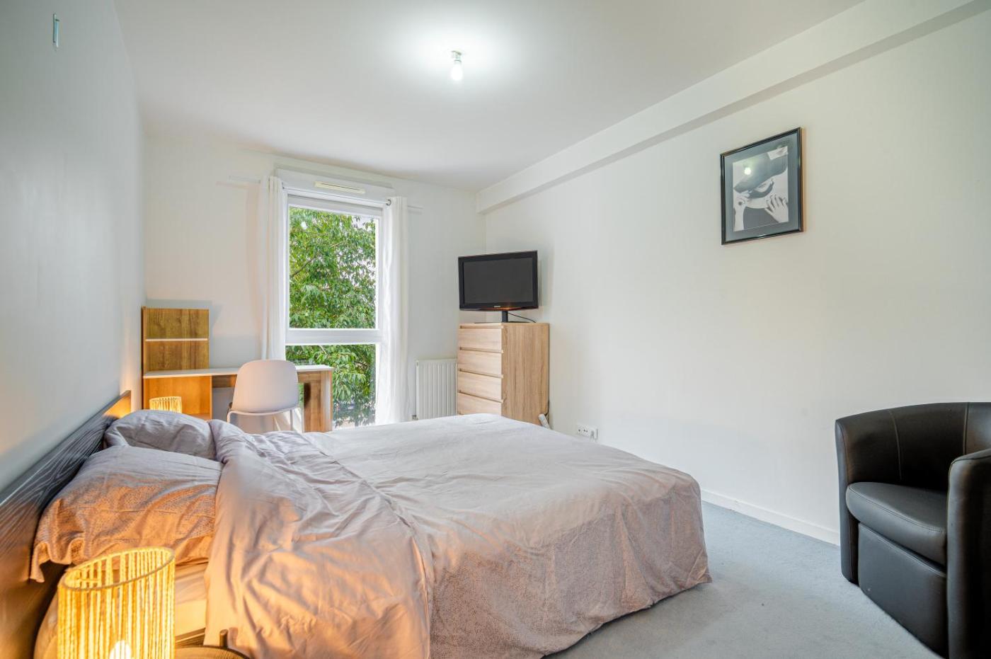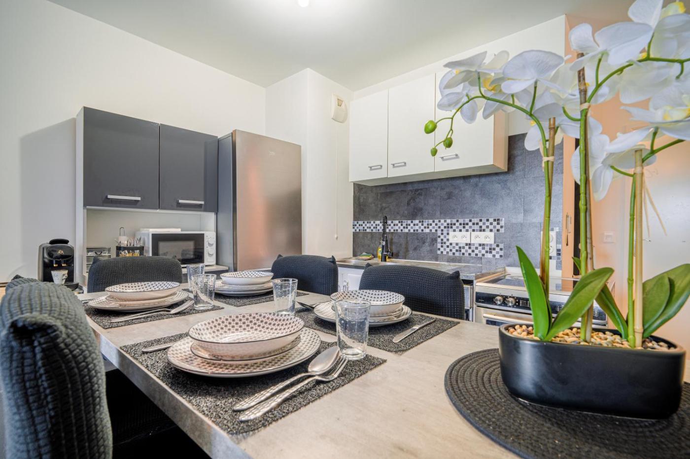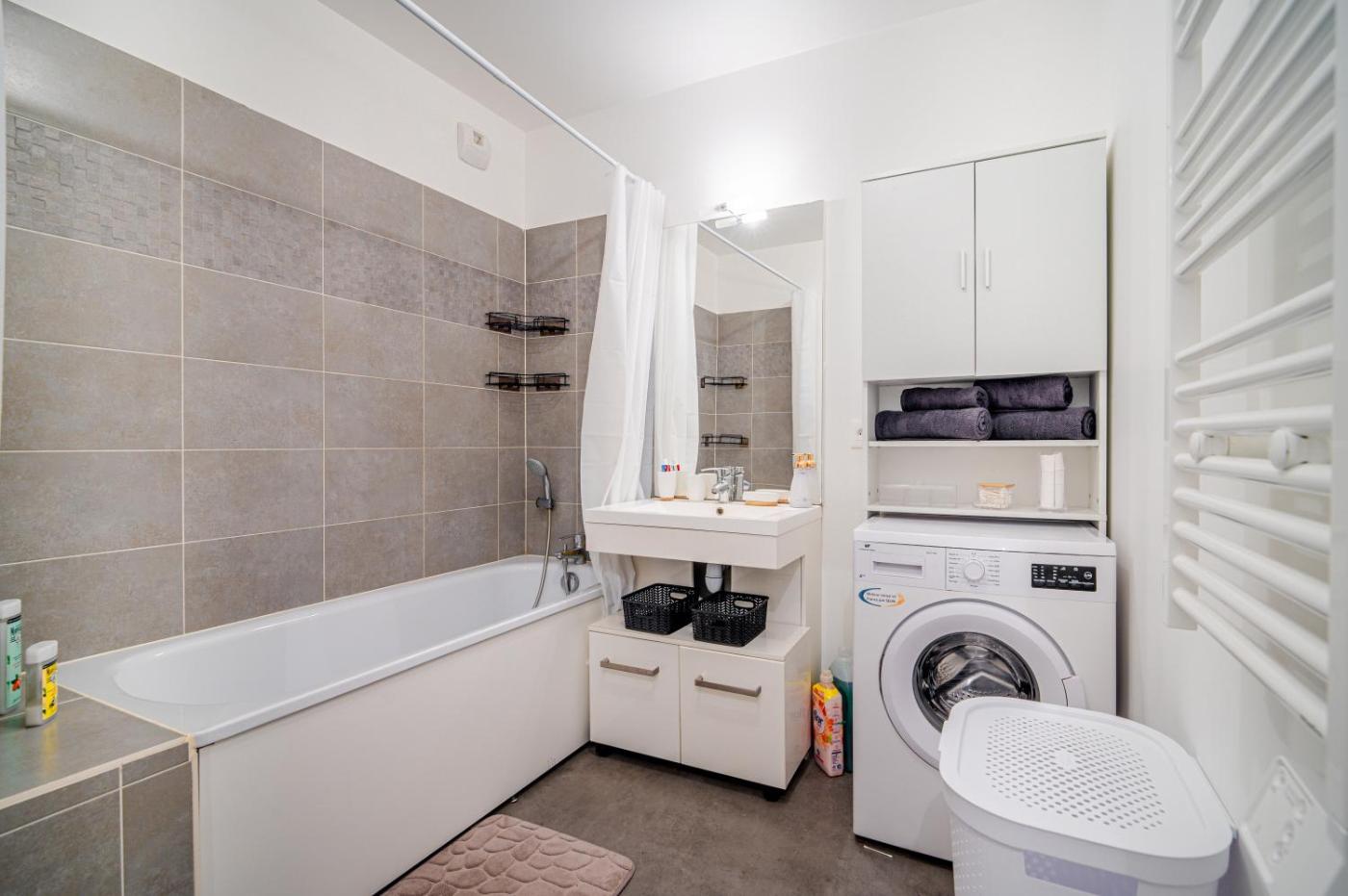Appartement 2 Chambres. Boasting a private entrance, this air-conditioned apartment comes with 1 living room, 2 separate bedrooms and 1 bathroom with a bath and a shower. Guests can make meals in the kitchen that features a stovetop, a refrigerator, a dishwasher and kitchenware. The spacious apartment features a washing machine, soundproof walls, a minibar, a flat-screen TV with streaming services, as well as garden views. The unit has 4 beds.